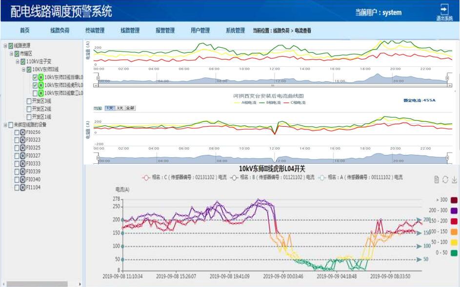 導(dǎo)線負(fù)荷溫升監(jiān)測系統(tǒng)綜合運(yùn)用了太陽能取電、無線通信及信息網(wǎng)絡(luò)等現(xiàn)代科學(xué)新技術(shù)。能實(shí)時準(zhǔn)確地在線監(jiān)測線路狀態(tài),并將所采集到的負(fù)荷及溫度等信息發(fā)送回主站中心;主站對信息進(jìn)行數(shù)據(jù)統(tǒng)計、分析、拓?fù)溆嬎悖_定負(fù)荷溫升狀態(tài),從而引導(dǎo)工作人員定位隱患。為提高相關(guān)工作人員的效率、減輕勞動強(qiáng)度提供了一種強(qiáng)有力的手段;同時,溫度信息會通過短消息發(fā)送到供電局生產(chǎn)管理部門、線路專工、線路維護(hù)負(fù)責(zé)人等設(shè)定的相關(guān)人員的手機(jī)上,能有效提高線路故障檢測的自動化水平,及時為線路安全性能監(jiān)測提供科學(xué)有效的依據(jù),為電力的輸送及減人增效提供條件。